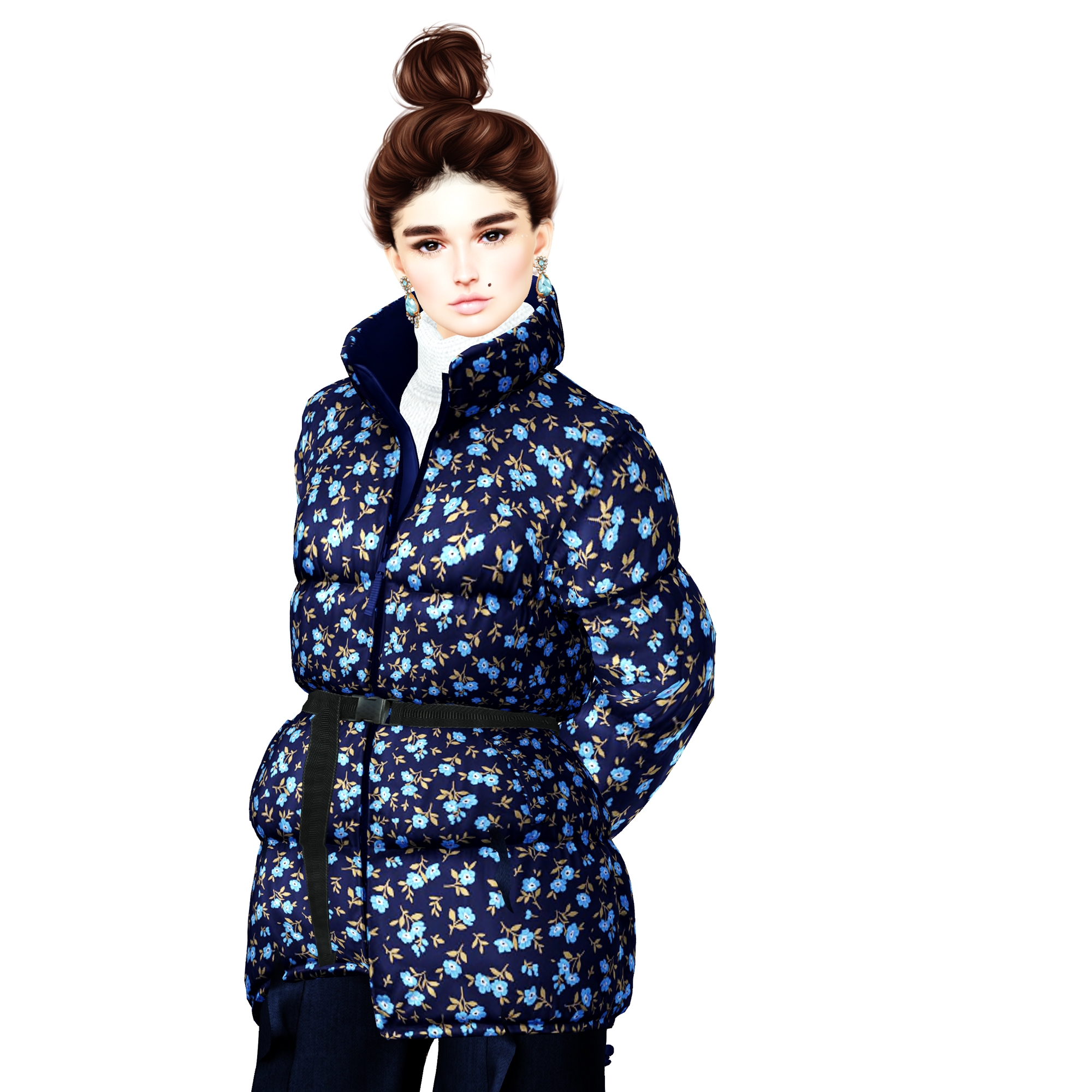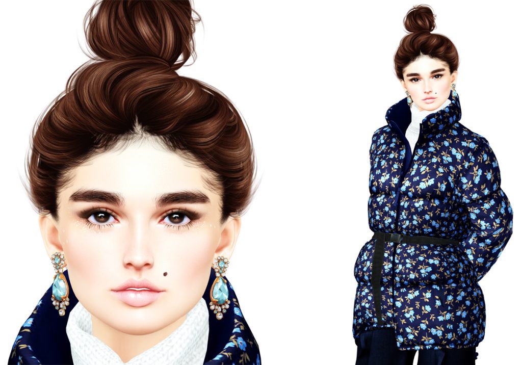 Anyway, I’ve been wearing this in SL all week – but just never got around to blogging it thanks to the aforementioned show. But I didn’t want to let it just pass me by. I love this this simple gift skin from DeeTaleZ (part of the LeLutka 12 Days of Christmas). I’m not sure if the snowflakes are always visible even without the eye makeup included, but either way, it’s in Nordic – my favorite tone – and really suits my wintery look. The puffer is new from Pixicat. As you know floral isn’t usually my thing, but just like that, I’m very into it.