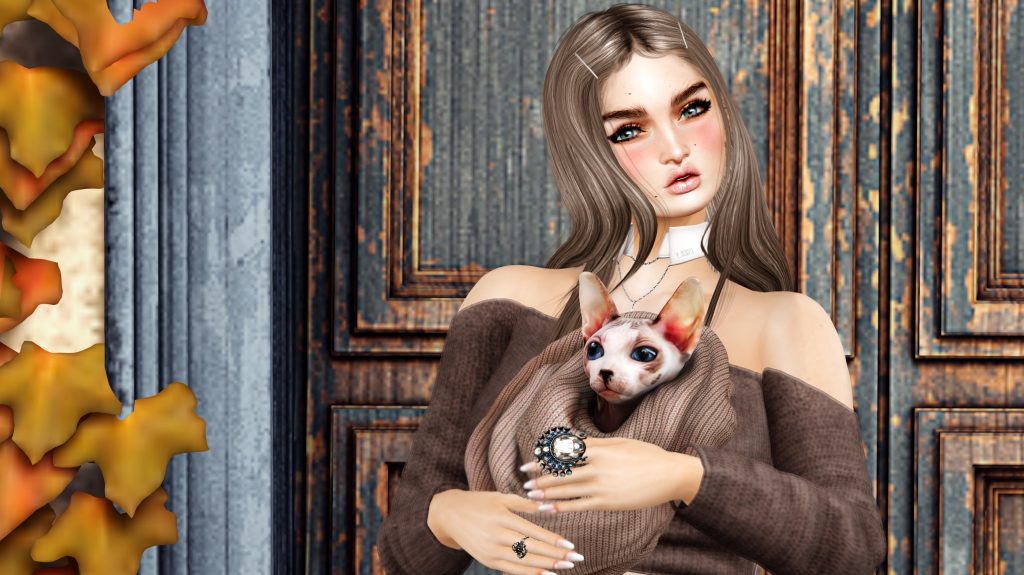 A couple new items that I should mention about this style. The new Tram hair is lovely and I much prefer it without the bangs; and I was able to pair the new cropped sweater from UFO with a simple jumpsuit that I was waiting to blog in another color. Of course the kitties are the real stars. I am cat-less IRL after the death of my sweet rescue Gabriel this past Spring. I miss him so very much!