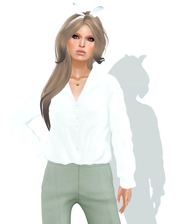 My clothing is mostly new from some recent events. Special mention for some of my favorite flats I have found recently from Breathe. I think when I last visited the main store, the shoes were only Slink. These (on the left) have a fitted Maitreya version and they’re available at IDK. I love them. The pants outfit from Dami is very, very much how I dress IRL on most days, like it’s taken from a page in a JCrew catalog. However the sizing on this single set runs very small I would say. I am wearing the large because fitting it with a mesh body was tricky around the chest area. Be sure to demo (unlike me!!!)