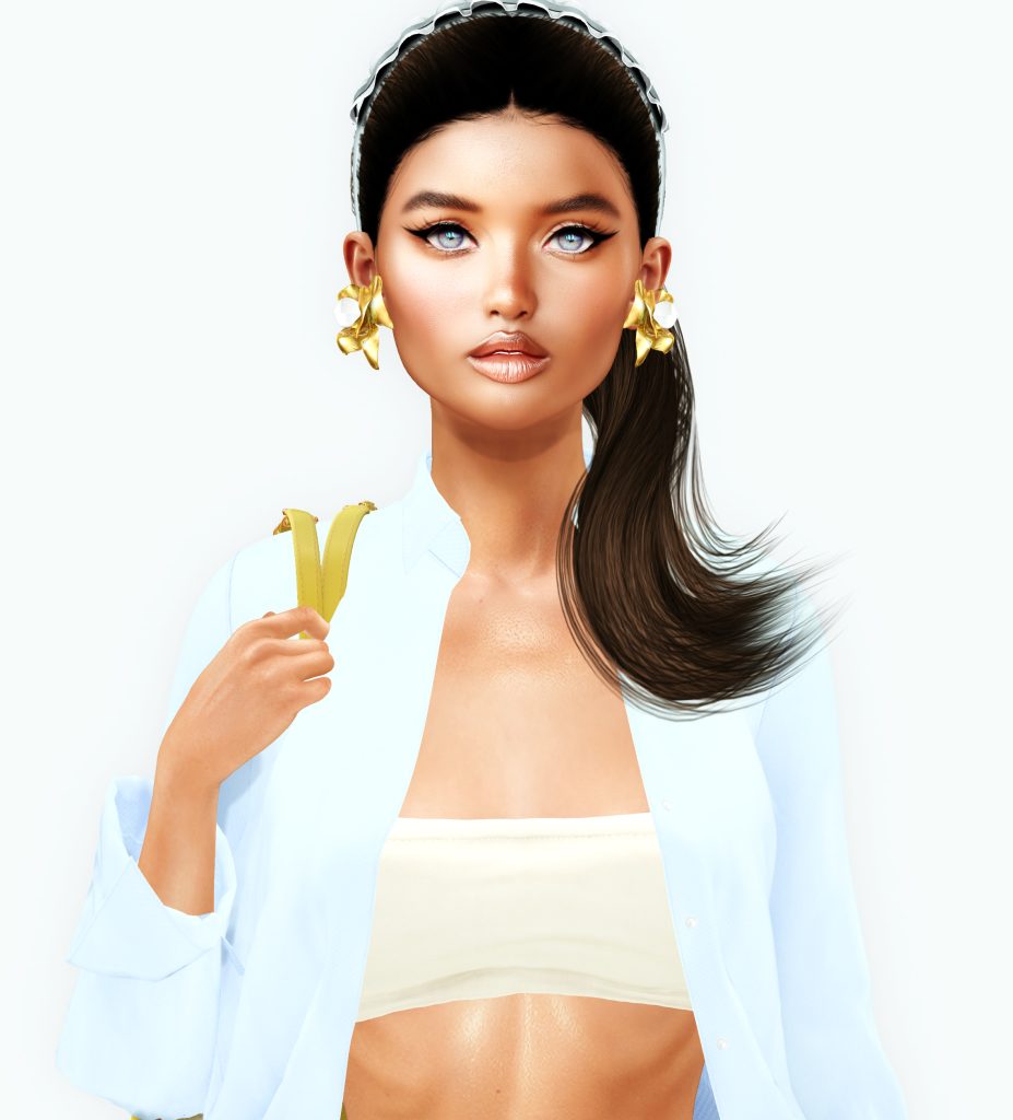Today was 86F outside; undoubtedly the first serious summer swelter of the season. IRL I was – dare I say it – almost chilly inside my loft (what a nice problem to have on a hot day), working away in front of my laptop in a sweatshirt. Meanwhile in SL, my avatar went full beach mode. And yes, my hair and headband are more beauties from Hair Fair 2024. A simple pony for breezy, humid heat; a headband for the flyaways.