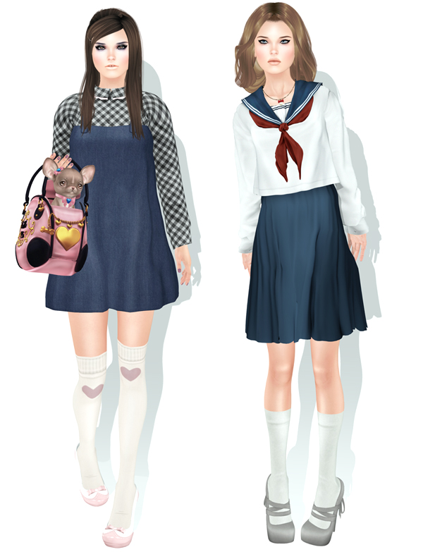 Both outfits are sweet although not really 100% my style (a bit too schoolgirl), from The Chapter Four. The C’est la vie offering has a color change blouse, which I changed to be dark gingham with pink lace trim; and the Offbeat school uniform ensemble is gacha only (and in one size).