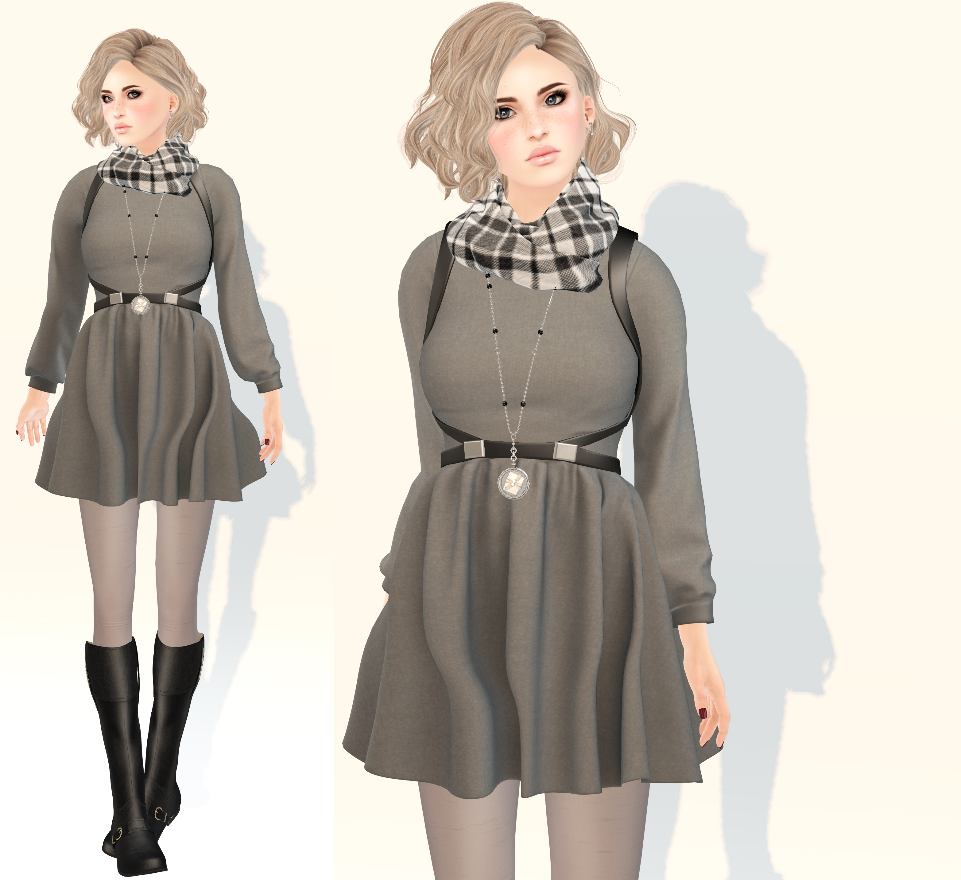 The dress is by Ison. Very on trend and expertly marrying both modern and classic elements in a great length with beautiful textured merino fabric. There are also awesome shoes available but they are only for Slink feet. This is fine but it’s an inconvenience for me because I hate to mess with different body parts, appliers, etc. Maybe I am especially lazy but this is perhaps a product of being an oldbie where we never had to do that before? In addition, I wanted to wear tights with the dress and for the life of me, I could not get them to apply to my Slink feet, even when I applied them successfully to my Physique mesh body with no issues. *boggle* I just scrapped it and decided to wear some of my favorite boots by Just Design with my Maitreya Lara body.