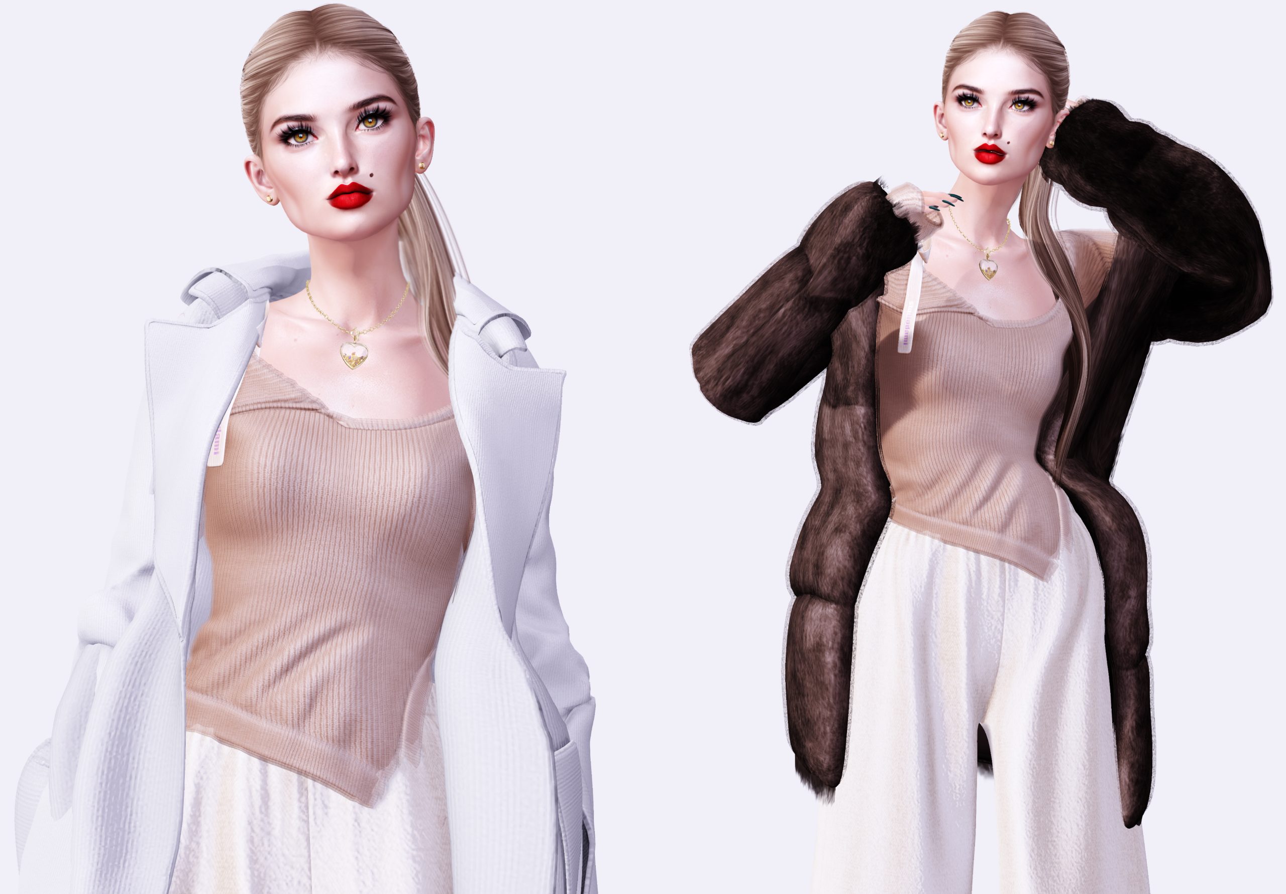 I styled this simple neutral look with two options for outerwear. I actually love both outcomes. Coats and jackets are notoriously hard for me to style in SL because they often come as part of an outfit, and it’s difficult to pair the coat with anything underneath that wasn’t specifically meant for it. These both worked OK – though not perfectly. As always, YMMV.