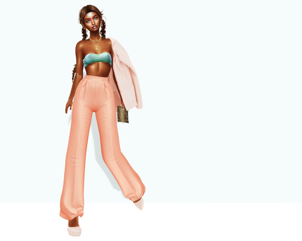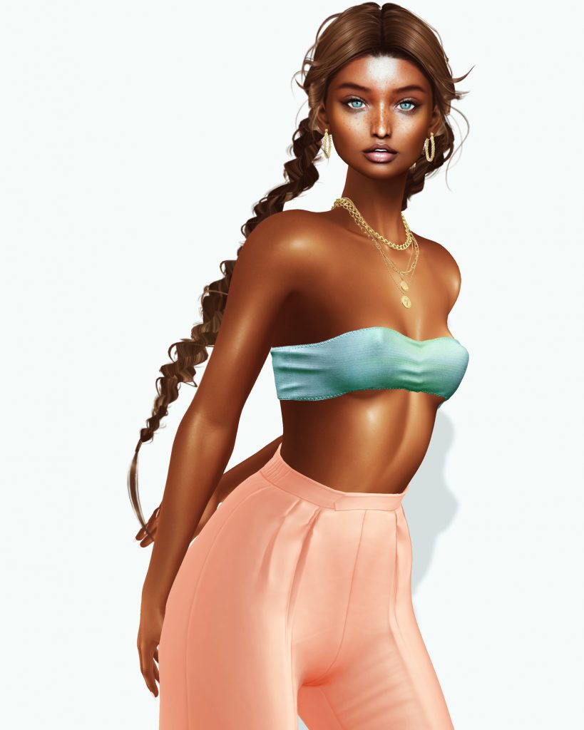 My trousers are new from Pixicat at Fameshed. If you want these in this pretty peach texture, you have to pony up for the fatpack. These are a cut I will wear again, so I went for it with only a slight pause. My gradient bandeau top is new (a bikini, actually) from Stories & Co., also at Fameshed. There was no fatpack option! I picked it up in three colors and would really like a white/iridescent style – and please, a fatpack option for next time.
