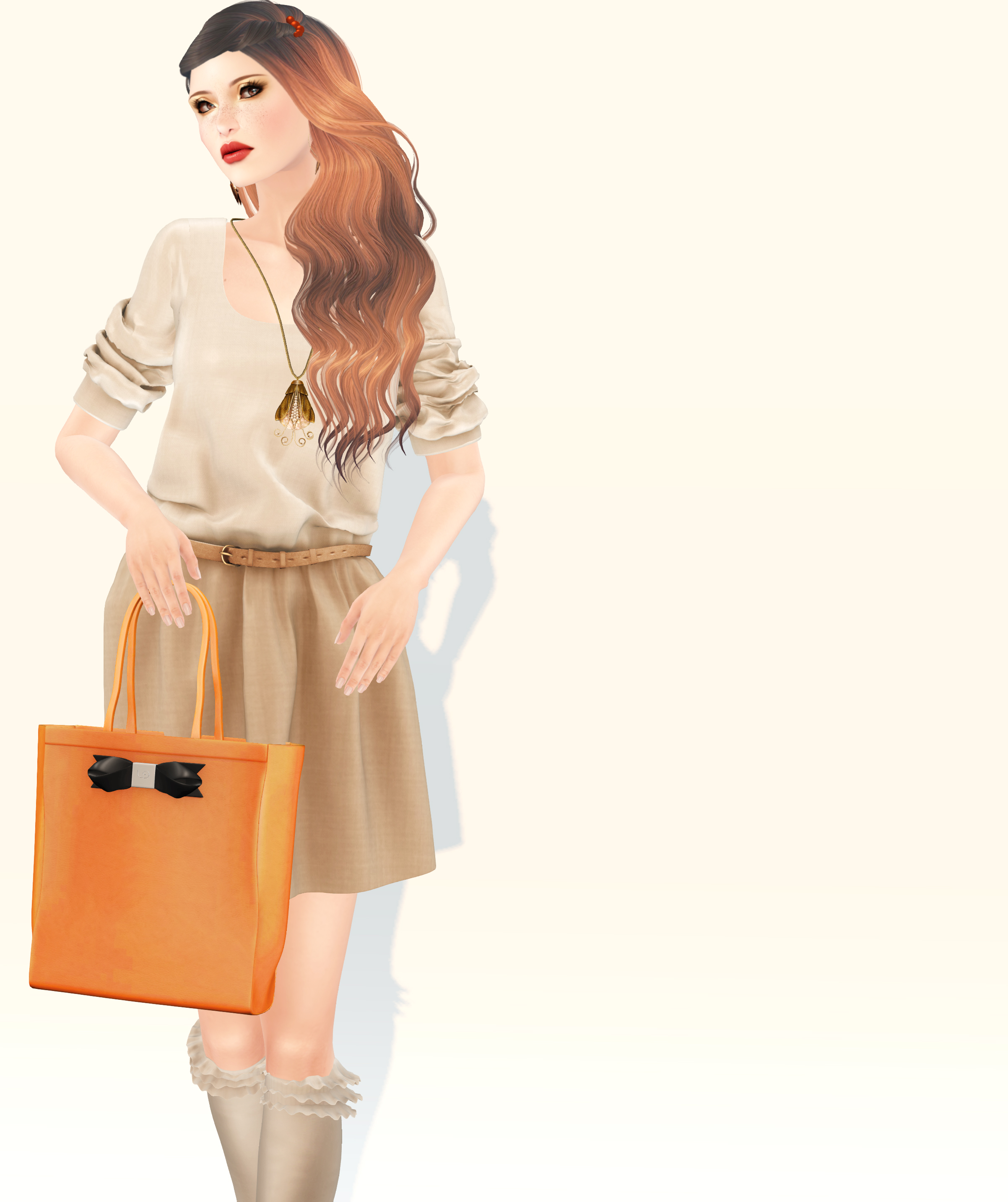 The second look is all based around the tangerine tote from LaGyo. It comes with 2 posed versions and a no pose option so you can actually walk around with it if you like. I love it but do wish the bow was color change. The dress is adorable from Zenith. Once again they capture incredible detail and feel for the fabric. There are very springy options available, but me being me, I stayed true to my preference for a neutral palette, especially when accessorizing with a bolder color. Instead of using the socks that come with the Just Design Polly shoes, I added the frilly socks from Atomic that you can find at Uber. My hair is also new from Little Bones, called “Latte” with a small, color change accoutrement of sweet, little berries.