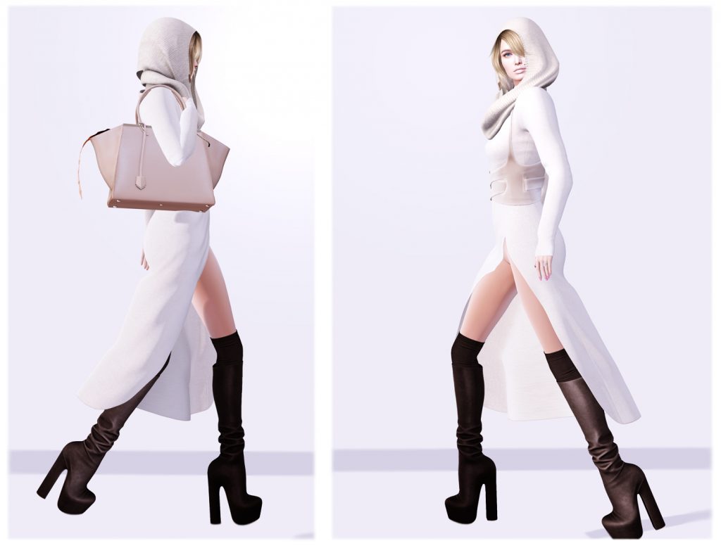 The dress and harness I have on are from Clef de peau, available at Kustom9. I appreciate the sophisticated slim design and modern accessory, but I also would have appreciated something to wear underneath it 😉 My beautiful hair and scarf are from our dearest Elikatira. So cozy but still sophisticated.